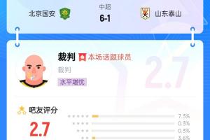 體育資訊04月19日訊 中超第8輪,十人國安6-1大勝九人泰山,主裁唐順齊單場出示三張直紅,賽后超過3300位吧友打分,唐順齊僅獲2.7分。
