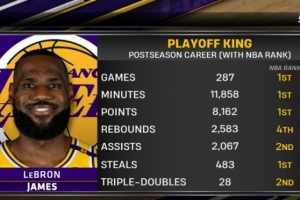 體育資訊4月20日訊 今日,媒體轉(zhuǎn)播商在賽前總結(jié)湖人前鋒詹姆斯的季后賽生涯數(shù)據(jù)歷史排名。