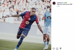 體育資訊4月20日訊 西甲第32輪,巴薩主場4比3擊敗塞爾塔。其中在本場比賽中,拉菲尼亞梅開二度,居功至偉。賽后拉菲尼亞更新社媒表示勝利歸功于球隊(duì)的團(tuán)結(jié)一心。