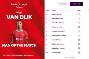 范迪克獲得了51.9%的投票,他本場(chǎng)傳球成功率87.7%。科納特獲得15.7%的投票排名第二,麥卡利斯特排名第三,他獲得13.3%的投票。