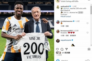 此役是維尼修斯皇馬生涯獲得的第200場(chǎng)勝利,俱樂部主席弗洛倫蒂諾向他頒發(fā)200勝紀(jì)念球衣,皇馬官方社媒曬出兩人的合照,對(duì)維尼修斯表示祝賀。