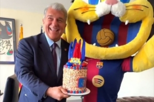 俱樂部官方分享的趣味視頻中,吉祥物CAT準備了一個巴薩主題的特制彩蛋蛋糕,并親自送到拉波爾塔的辦公室。拉波爾塔打趣道:“這是我人生中最幸福的日子之一,這個蛋糕太精美了,還有你陪伴。CAT現(xiàn)在可是大明星了?!?/p>