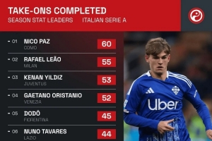 體育資訊4月23日訊 Squawka統(tǒng)計(jì)了本賽季的意甲球員過人數(shù)據(jù),科莫小將尼科-帕斯60次過人排第一。
