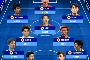 前鋒: 三笘薫(4500萬(wàn)歐元)、孫興慜(3000萬(wàn)歐元)、久保建英(4000萬(wàn)歐元)