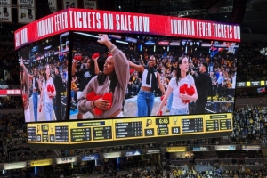印第安納狂熱隊(duì)球員凱特琳-克拉克 (Caitlin Clark)、阿莉亞-波士頓 (Aliyah Boston) 和凱爾西-米切爾 (Kelsey Mitchell) 到場(chǎng)觀看步行者隊(duì)與雄鹿隊(duì)的G2,幫忙向球迷們?nèi)忧蛎运投Y物。