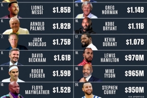 >運動員收入前10:喬丹30億居首&經通脹調整后41.5億詹姆斯排第四。而在名單11-20里,有四位NBA球員分別是" />