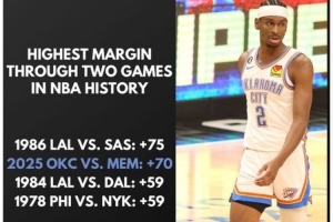 系列賽前兩場,雷霆凈勝70分,排名歷史第二,僅次于1986年的湖人,那輪系列賽湖人前兩場凈勝馬刺75分。