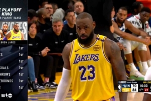 詹姆斯季后賽在場數、出場時間、得分、投籃命中數、罰球命中數、防守籃板、搶斷七項數據都高居聯(lián)盟歷史第一。