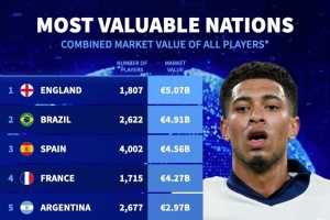 體育資訊4月23日訊 德國轉(zhuǎn)會市場統(tǒng)計了各國球員的總身價,并列出榜單,英格蘭59.7億歐居首,巴西、西班牙二三位。