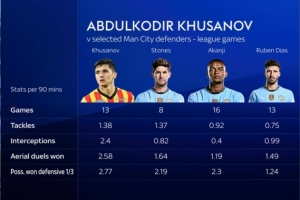體育資訊1月11日訊 根據(jù)多家媒體的報道,曼城即將簽下朗斯20歲中衛(wèi)庫薩諾夫,轉(zhuǎn)會費4000萬歐加獎金。天空體育對比了庫薩諾夫和曼城部分中衛(wèi)本賽季的聯(lián)賽數(shù)據(jù)。