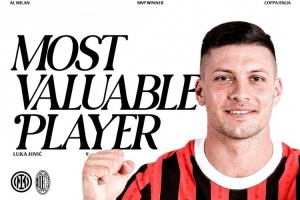 米蘭官方社媒曬出海報,宣布約維奇當(dāng)選德比戰(zhàn)米蘭隊內(nèi)最佳球員。