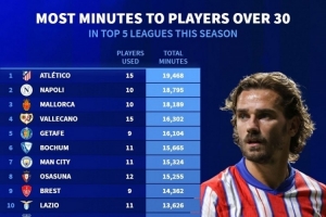 體育資訊4月25日訊 德國轉(zhuǎn)會市場統(tǒng)計了本賽季五大聯(lián)賽球隊年齡30+球員的出場總時間,并列出榜單,馬競居首,那不勒斯次席。